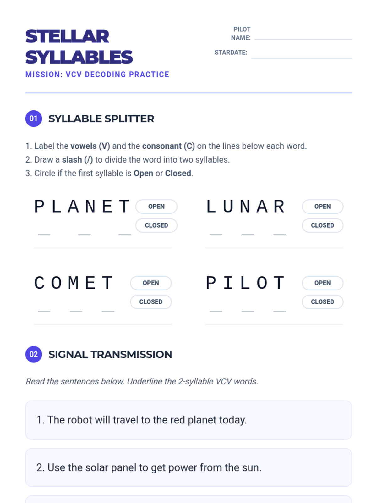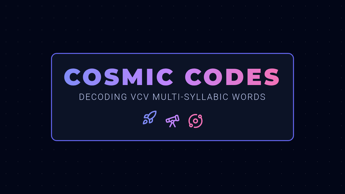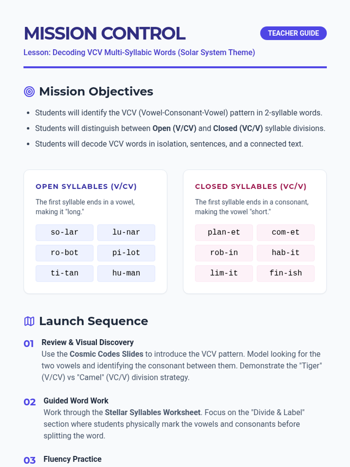 A comprehensive teacher guide for the Cosmic Codes lesson, featuring word lists, instructional strategies, and differentiation tips for VCV syllable patterns.