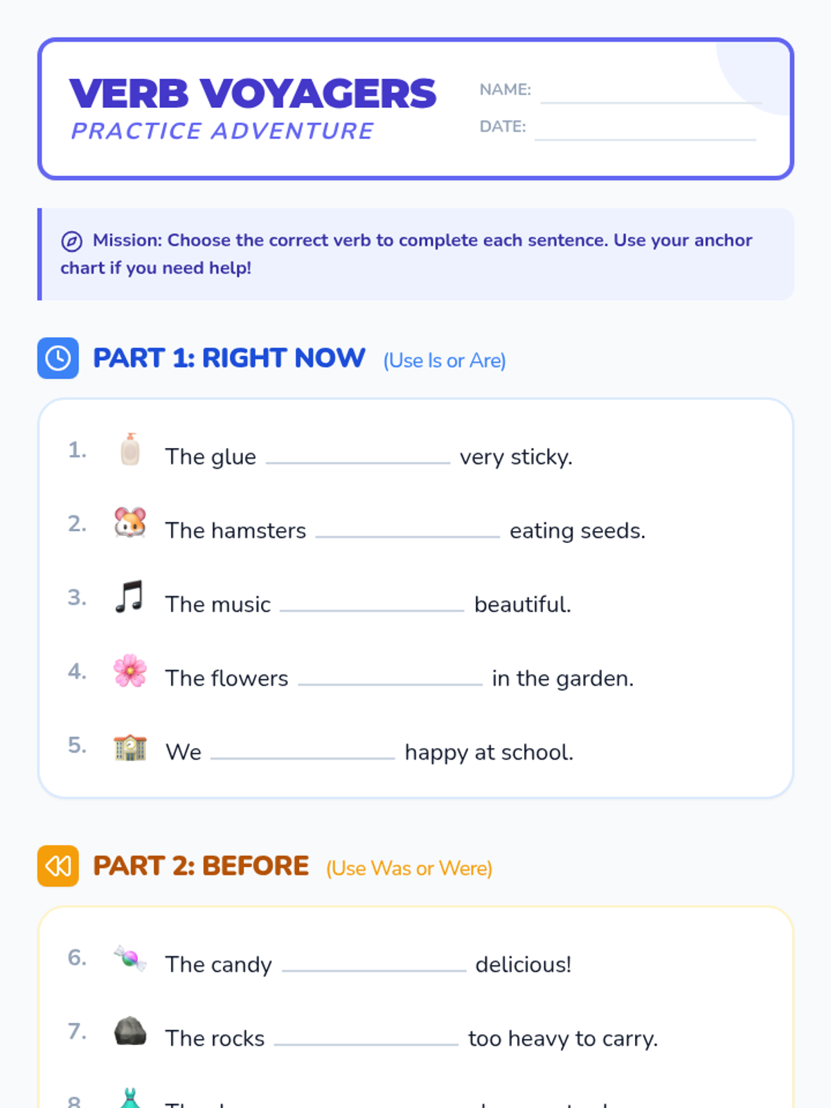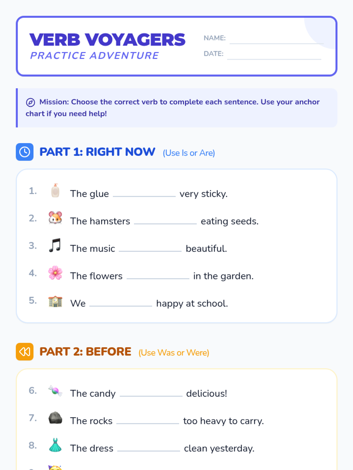 A practice worksheet for 3rd grade ESL students to apply 'is', 'are', 'was', and 'were' using thematic nouns and pronouns. Includes fill-in-the-blank and sentence writing activities. Revised prompts for better alignment with pronouns.