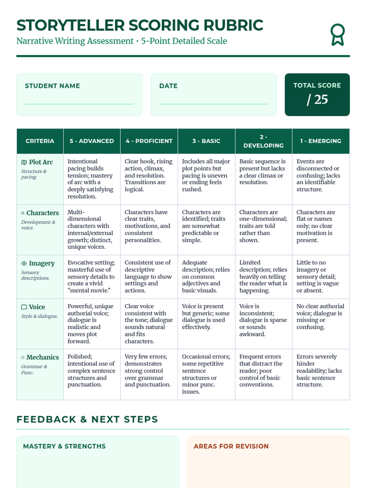 A refined 5-point teacher-facing rubric for assessing narrative writing across plot, characters, sensory details, voice, and mechanics, designed for clear differentiation.