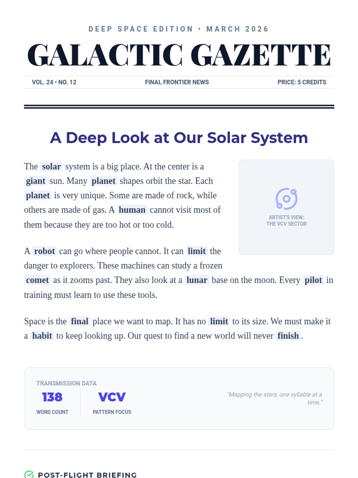 A space-themed newspaper article (approx. 140 words) designed for reading practice, featuring highlighted VCV words and comprehension questions.