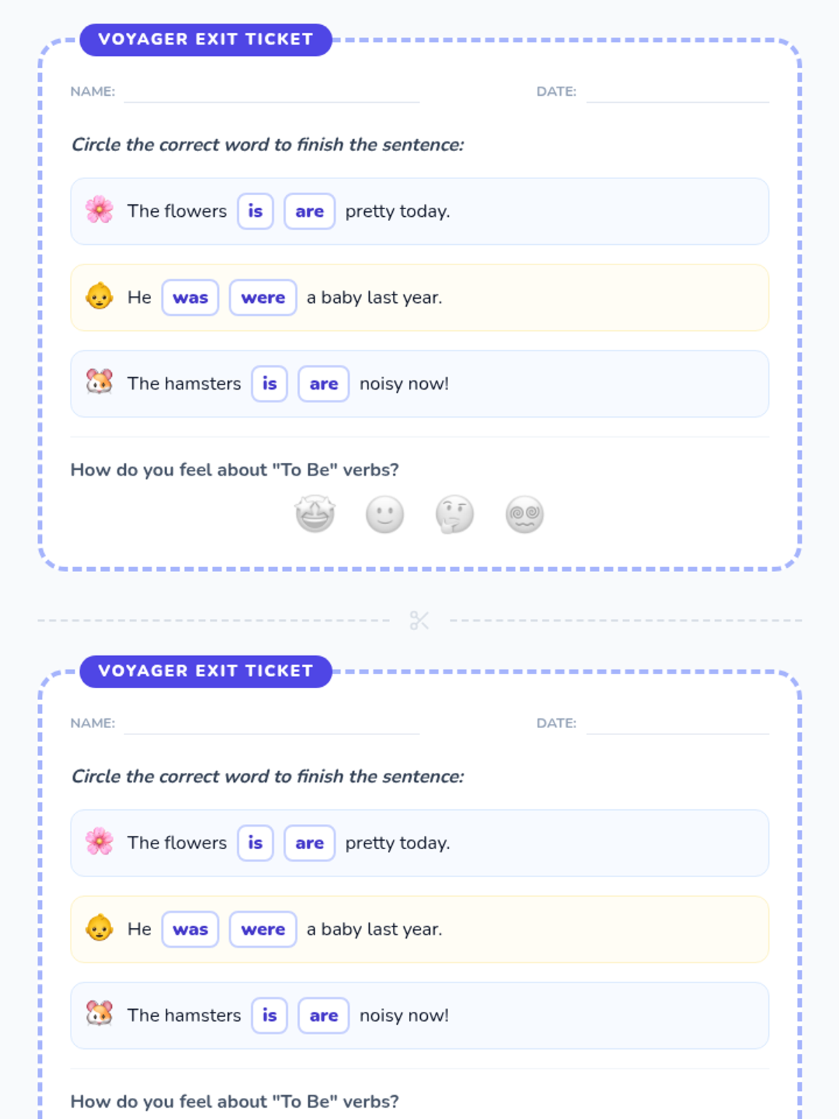 A student exit ticket for the Verb Voyagers lesson, featuring three quick assessment questions on 'is', 'are', and 'was' with visual cues. Designed with two tickets per page for easy printing and cutting.