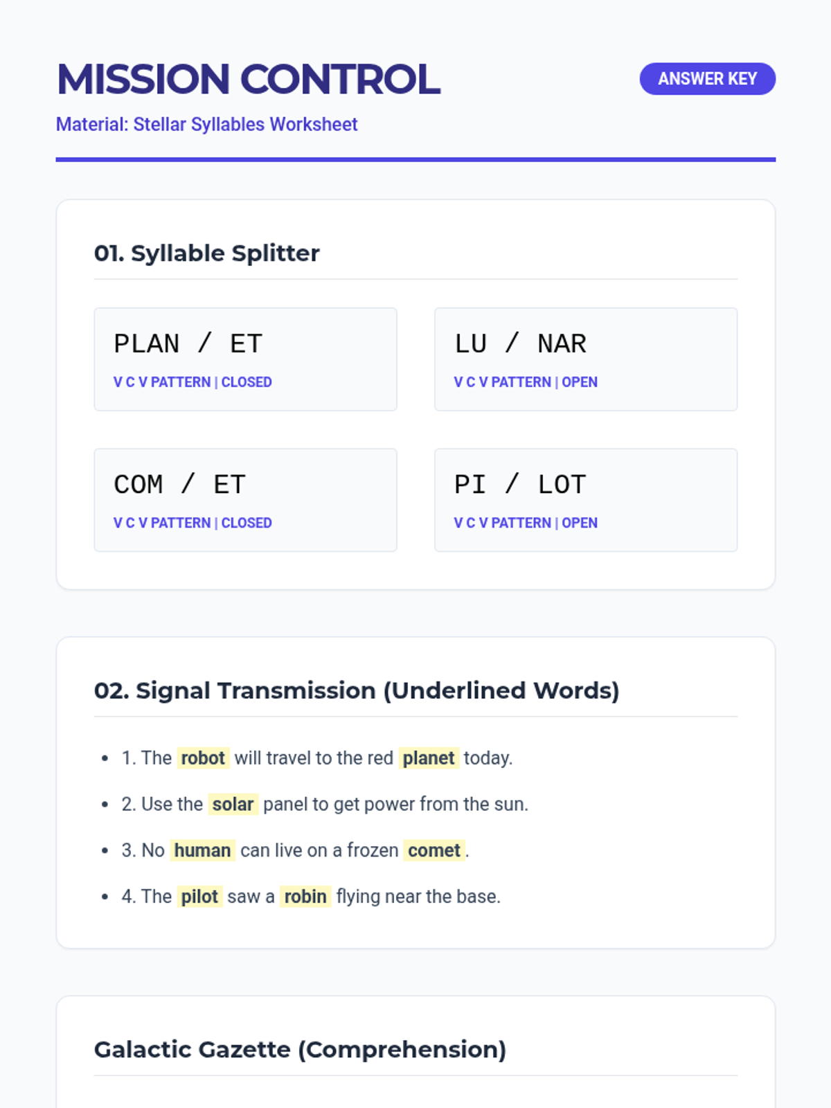 The answer key for the Cosmic Codes student materials, providing correct syllable divisions and comprehension question responses.