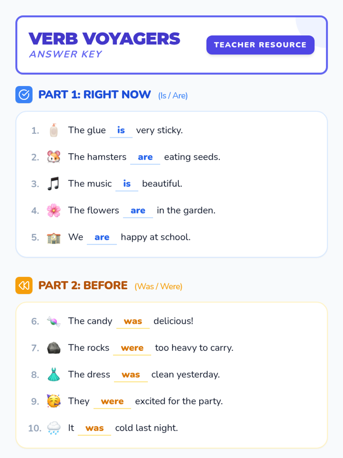An answer key for the Verb Voyagers practice sheet, providing correct verb choices for present and past tense exercises.