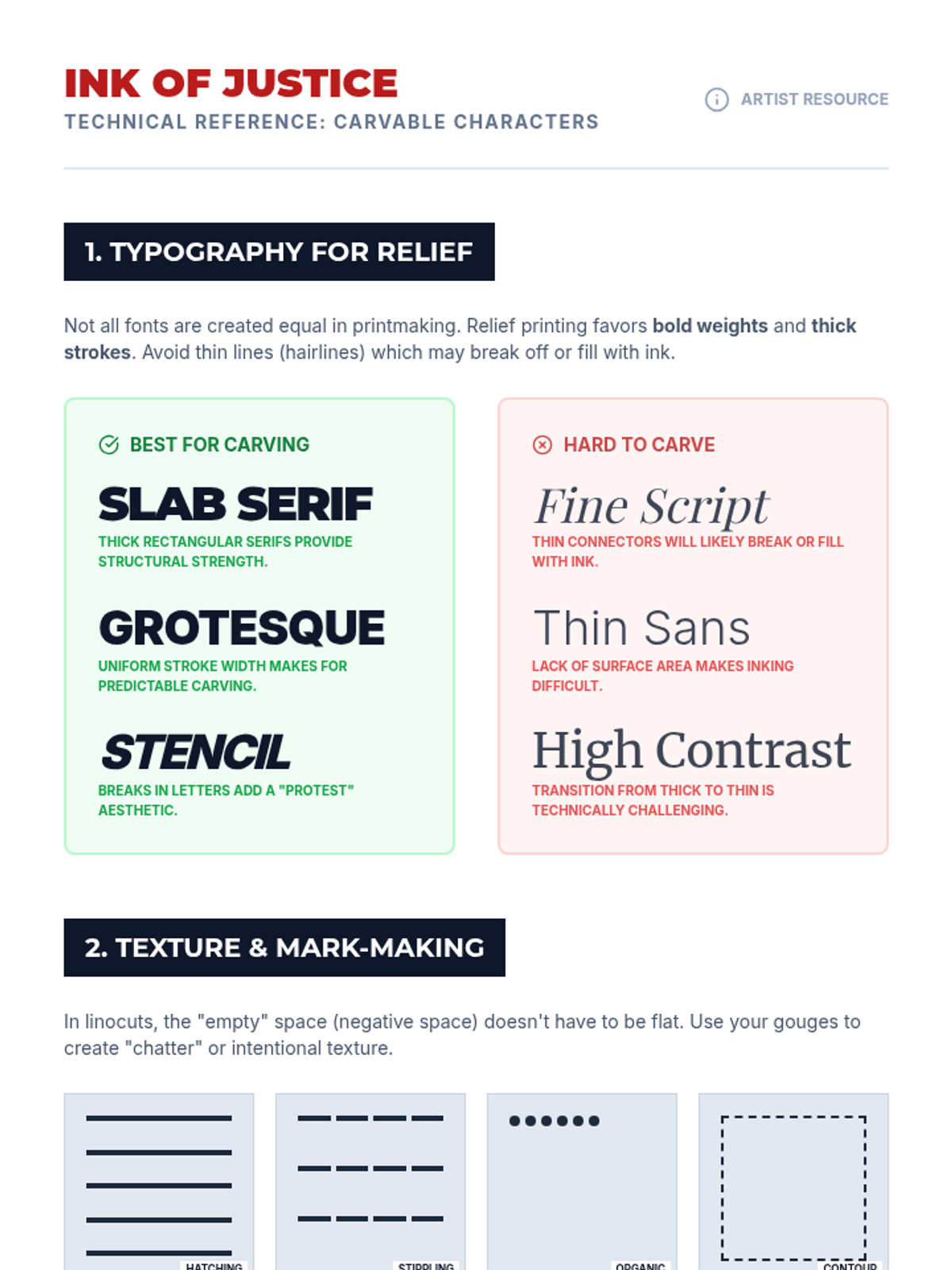 A technical reference sheet for students that provides visual examples of carvable font styles, texture techniques, and a reminder of the "mirror rule" for relief printing.