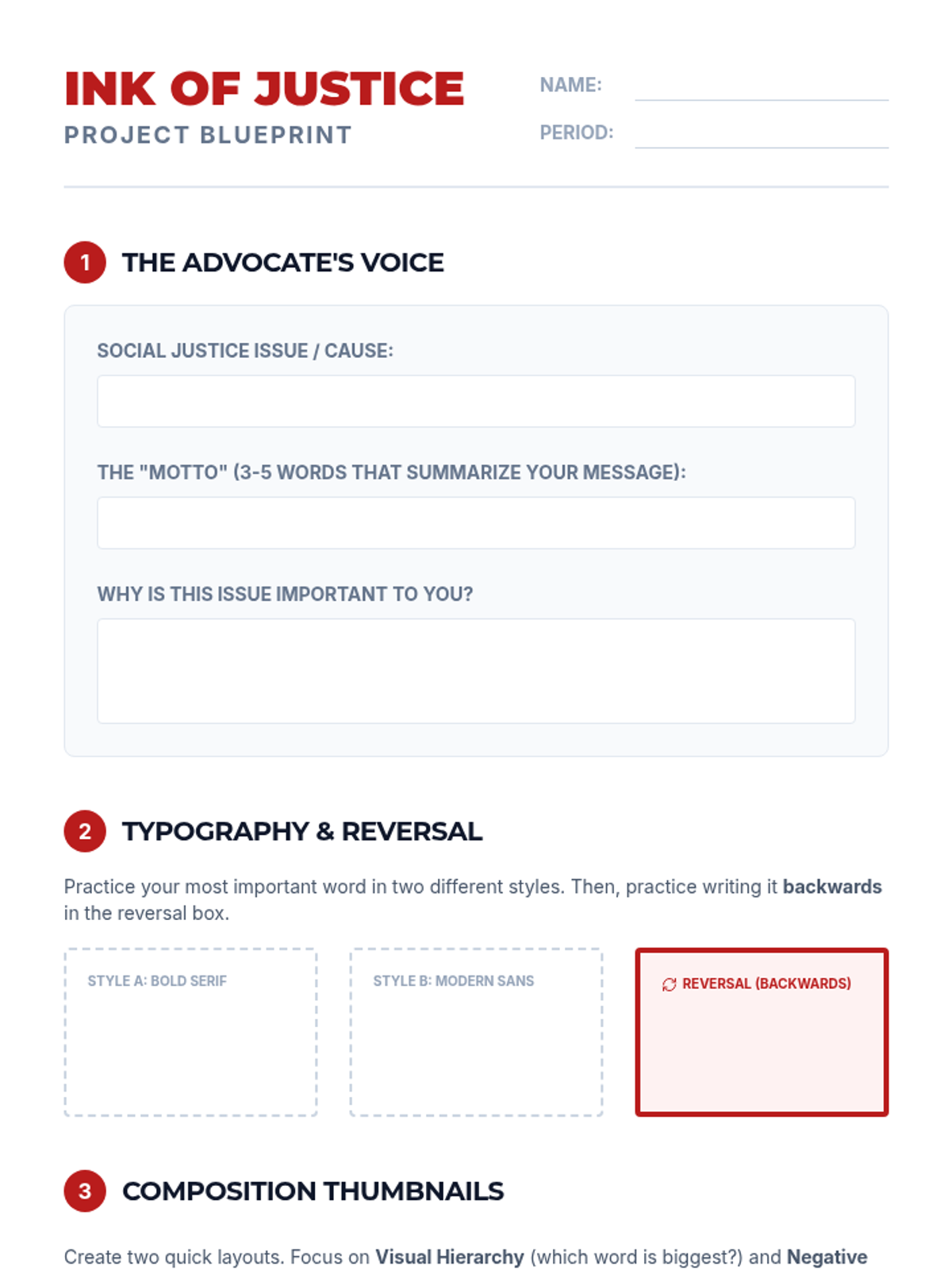 A student planning worksheet for the Ink of Justice project. It guides students through identifying their cause, practicing typography, reversing text for carving, and sketching compositions.
