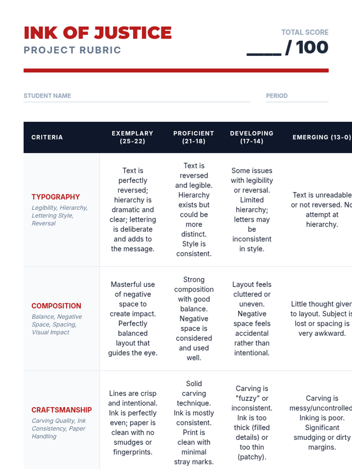 A detailed grading rubric for the Ink of Justice project, assessing typography, composition, craftsmanship, and advocacy on a four-point scale.