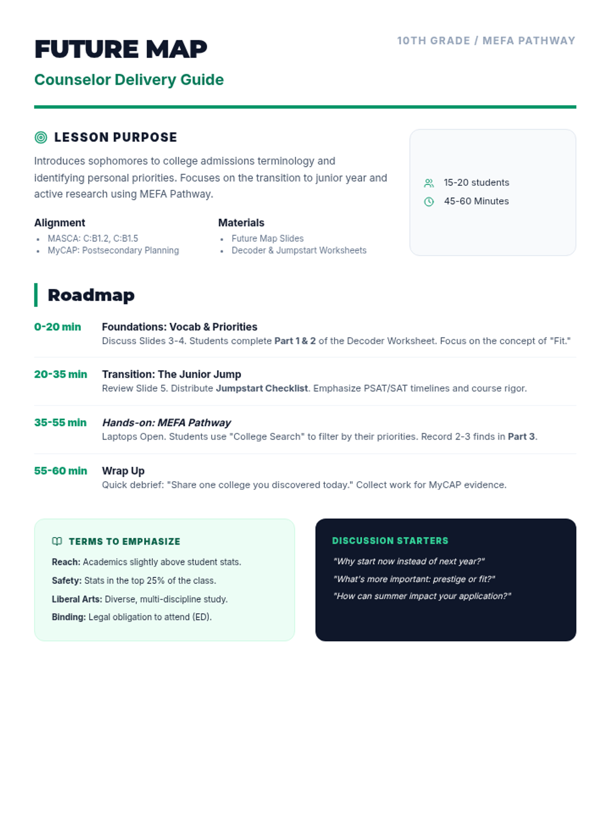 A facilitator guide for school counselors to deliver a college planning lesson to 10th-grade students, featuring pacing, standards alignment, and discussion prompts.