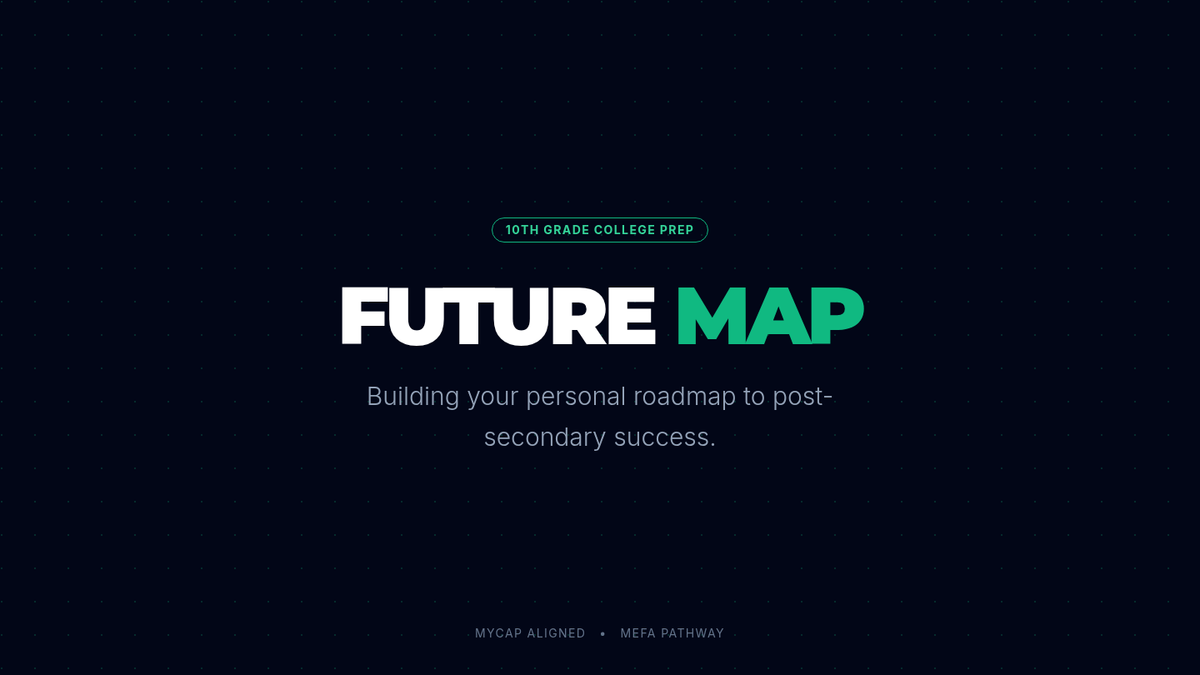 A visually engaging presentation for 10th graders covering college search terminology, factors for choosing a school, and the roadmap to junior year, integrated with MEFA Pathway instructions.