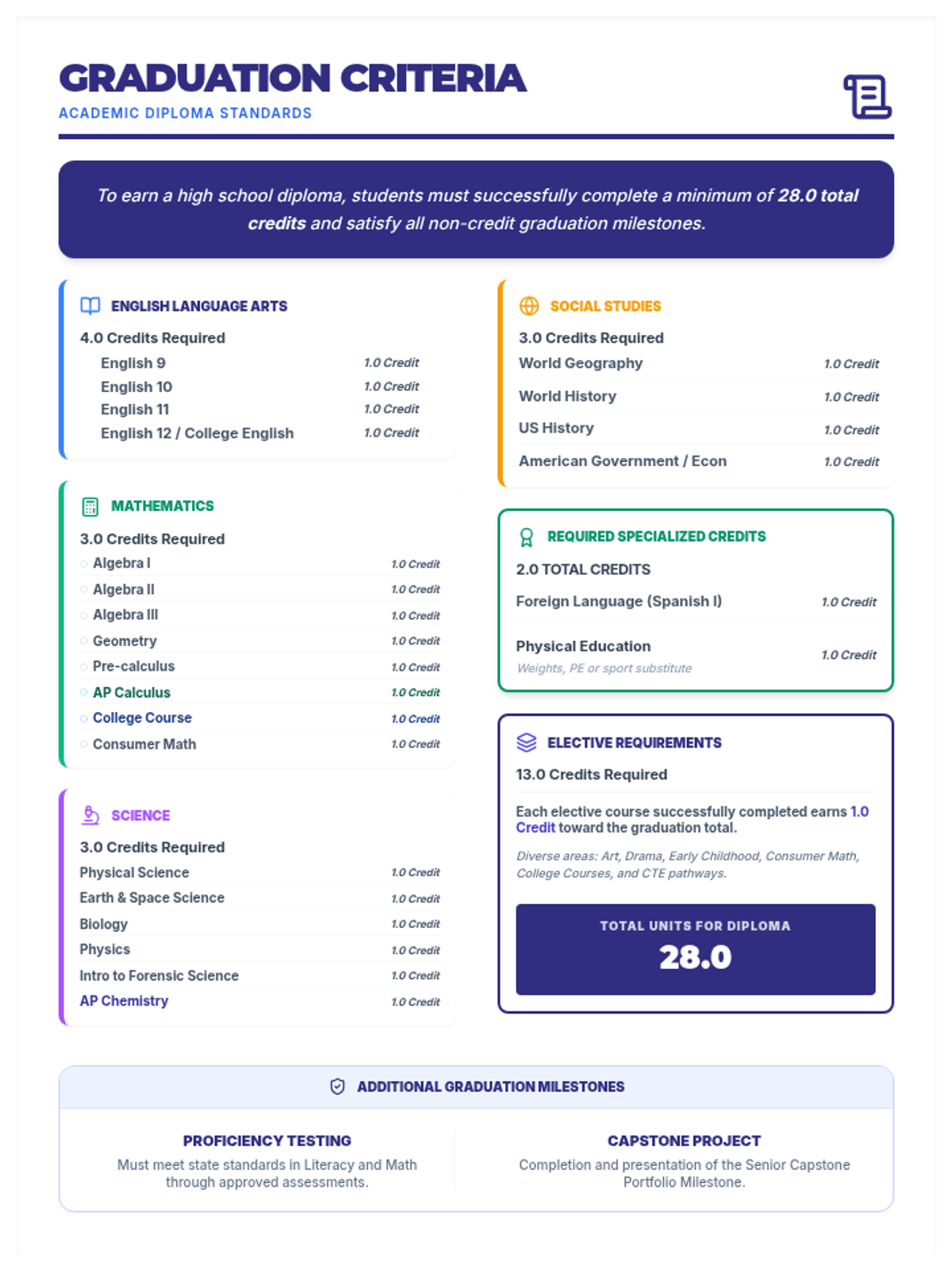 Updated graduation criteria reference sheet with '1.0 Credit' annotations for each listed course, ensuring clarity on the value of individual classes toward the 28.0 total credit requirement. Maintenance of clean, universal layout.
