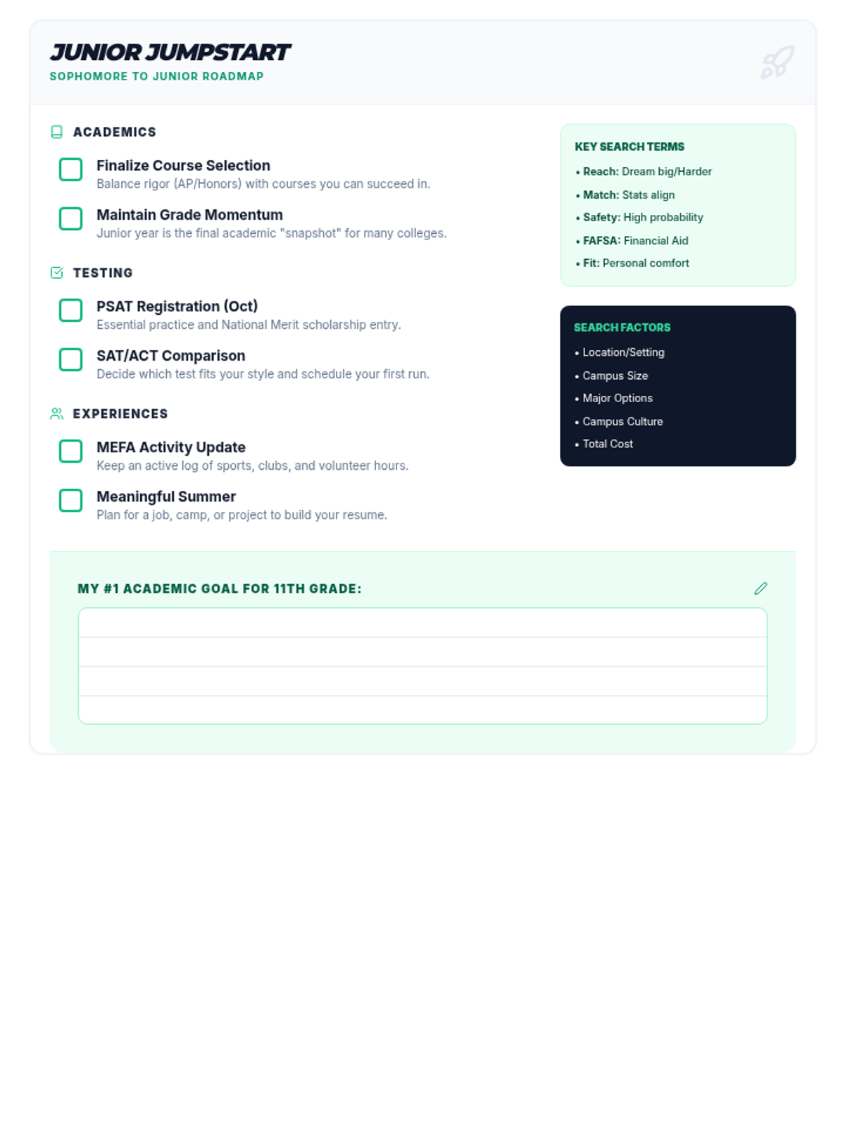 A transition planning checklist for 10th-grade students to prepare for the academic and testing requirements of their junior year.