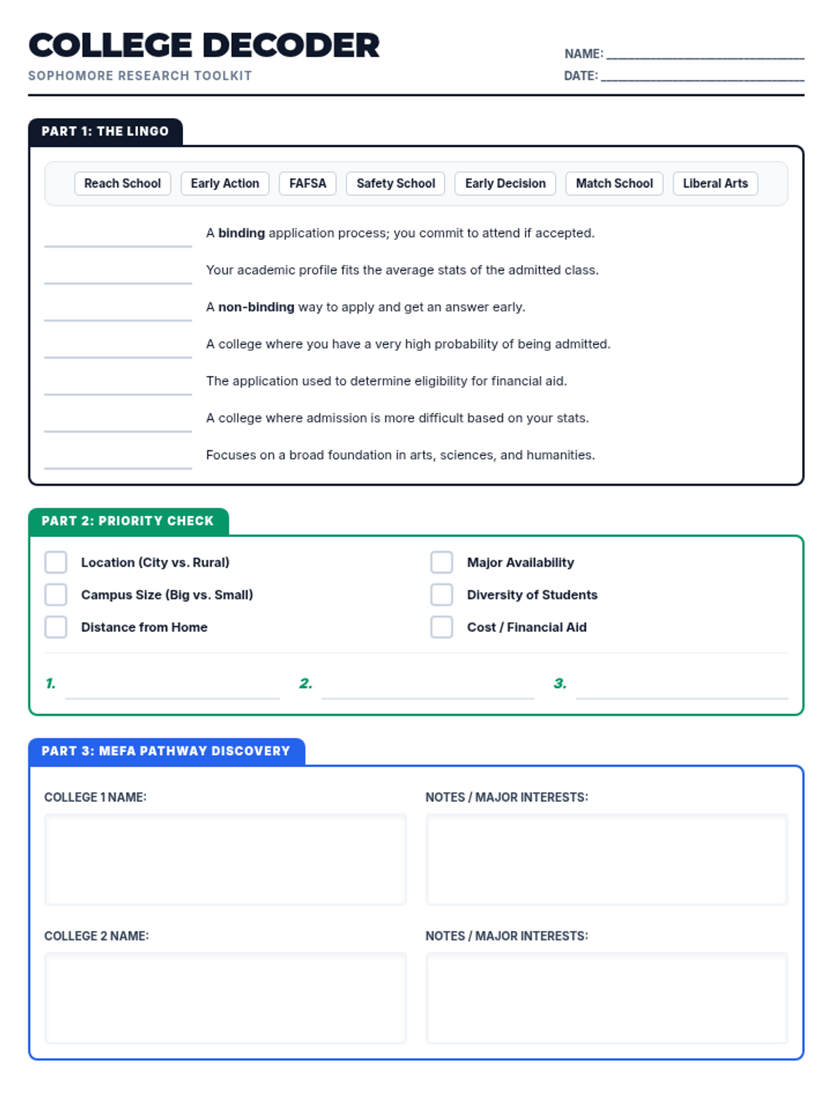 A student-facing worksheet used to master college search vocabulary, identify personal selection priorities, and record findings from the MEFA Pathway research session.