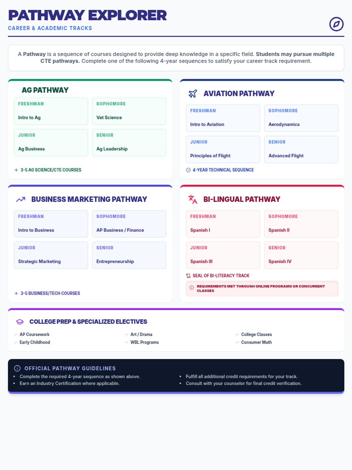 Updated the Pathway Explorer Handout to include a specific annotation for the Bi-Lingual Pathway, clarifying that requirements will be met through online programs or concurrent classes. The layout remains optimized for a single-page reference.