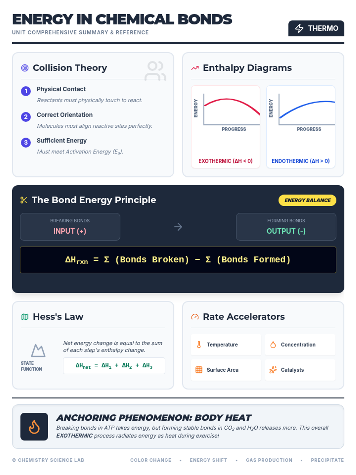 A high-impact infographic summary for the Energy in Chemical Bonds unit. It visualizes key concepts including Collision Theory, Enthalpy Diagrams, Bond Energy mathematics, Hess's Law, and reaction rate factors, all tied back to the anchoring phenomenon of body heat. Optimized for a single-page layout with improved LaTeX and contrast.