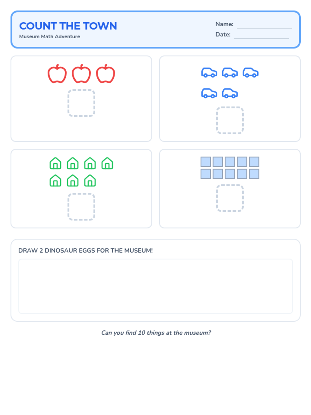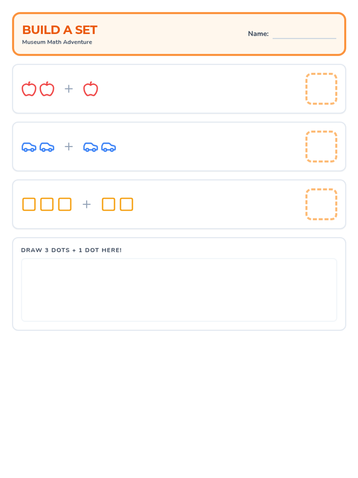 An addition worksheet with visual prompts and large work areas for preschool students to practice combining groups of museum-themed objects.
