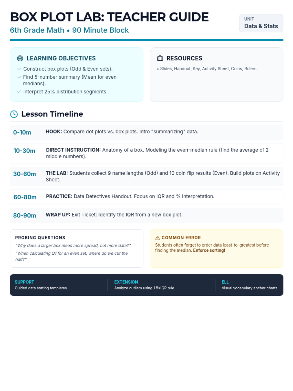 A teacher's facilitation guide for the 90-minute Box Plot Lab lesson, including a timeline, discussion prompts, and differentiation strategies.