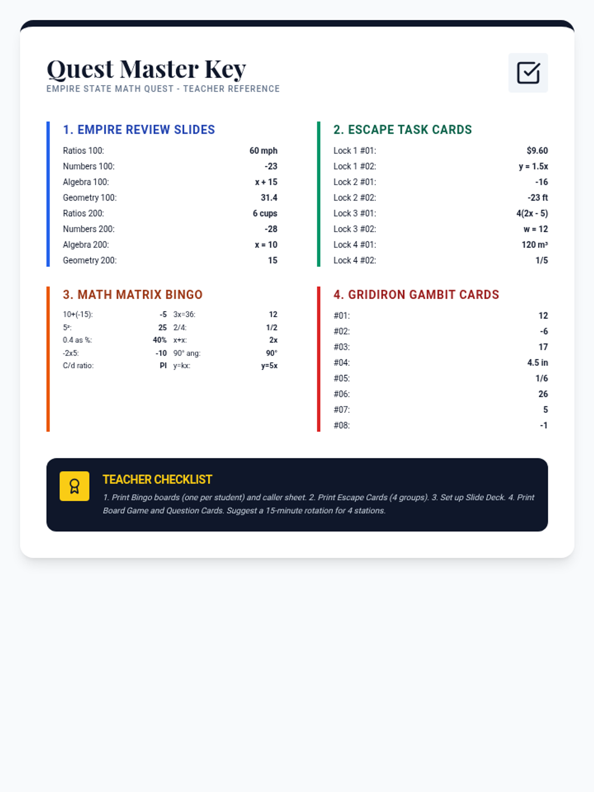 A comprehensive answer key for all four games (Empire Review Slides, Escape Task Cards, Math Matrix Bingo, and Gridiron Gambits), providing teachers with a single reference point for verifying student work.