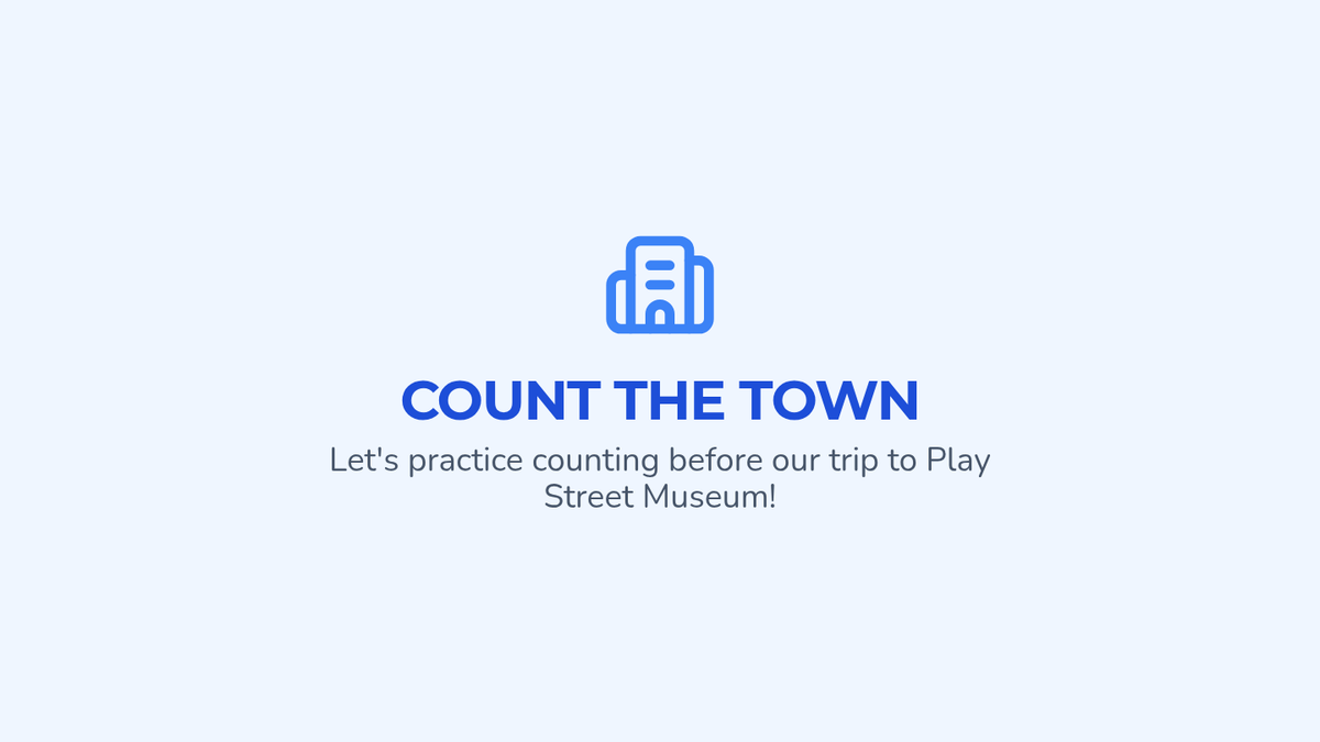 A brightly colored slide deck featuring large icons and high-contrast numbers to help preschool students with special needs practice counting objects from 1 to 10 in a museum town setting.