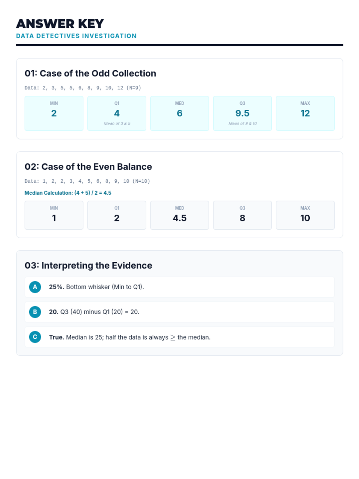 Teacher's answer key for the 'Data Detectives Handout', providing correct calculations for odd and even data sets and clear explanations for interpretation questions.