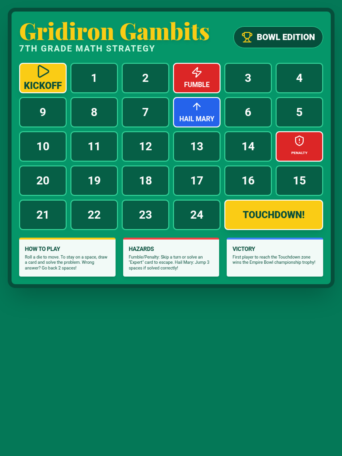 A football-themed math review board game featuring a winding path from 'Kickoff' to 'Touchdown'. Includes special hazard spaces like 'Fumble' and 'Penalty' to add strategic gameplay to math practice.