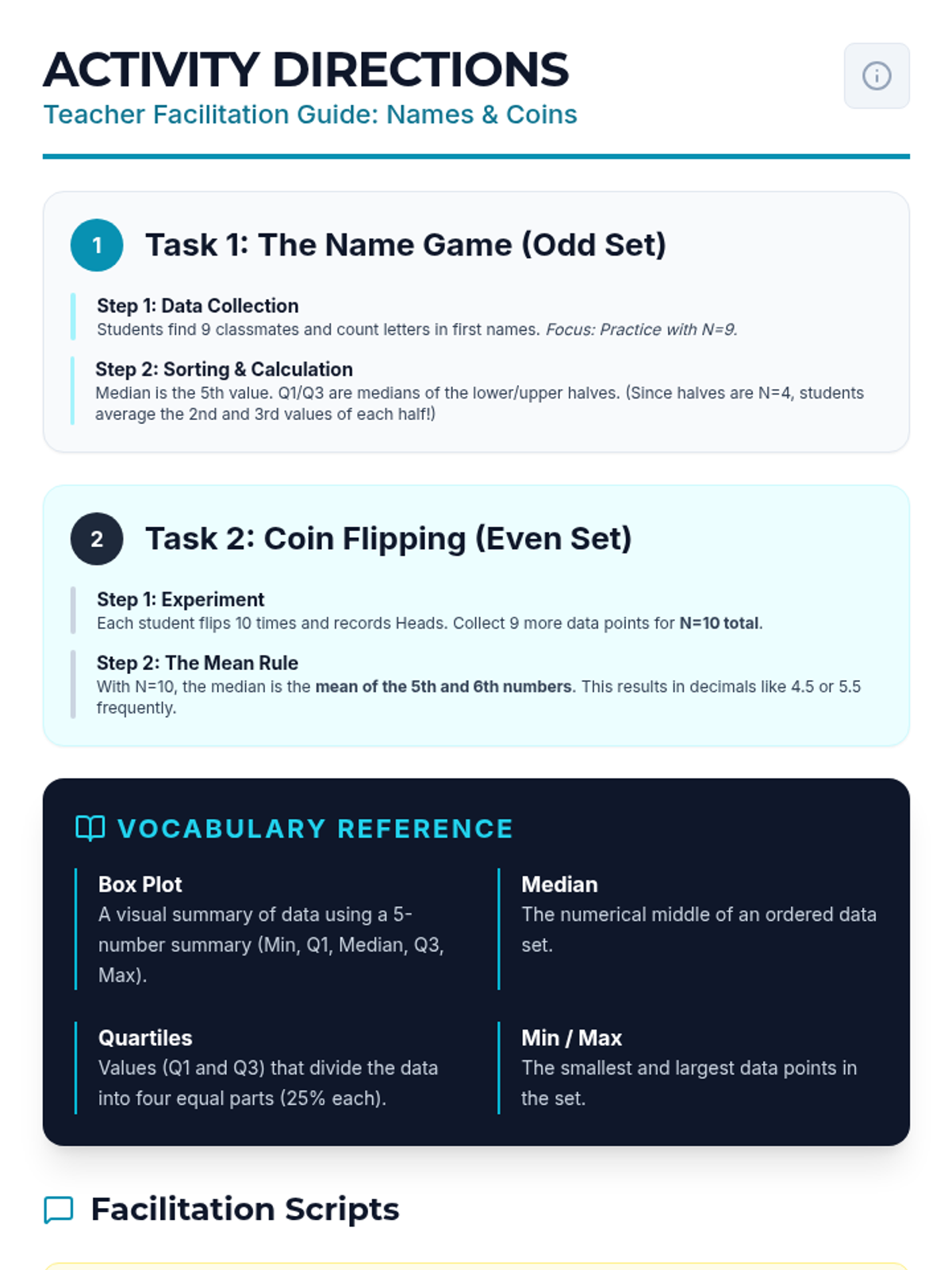 Detailed teacher-facing directions for facilitating the Name Game and Coin Probability activities, focusing on data collection, sorting, and median calculation.