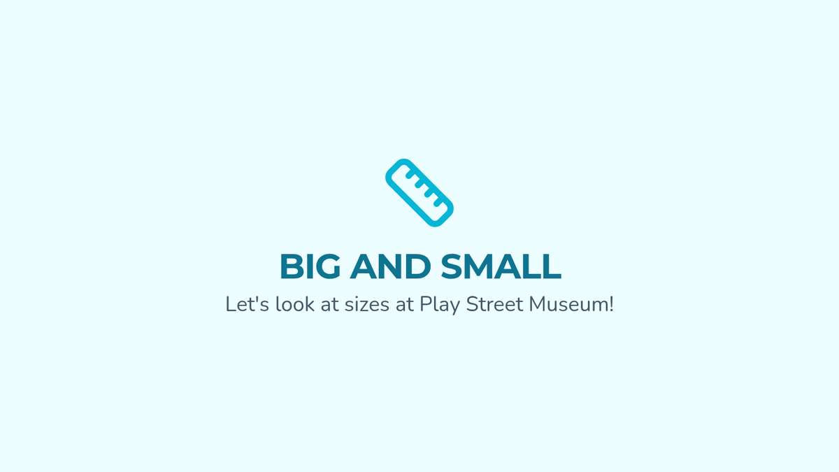 A visual slide deck focusing on size comparison using museum-themed items (trucks, fruit, blocks) to develop vocabulary and discrimination skills for preschool students.
