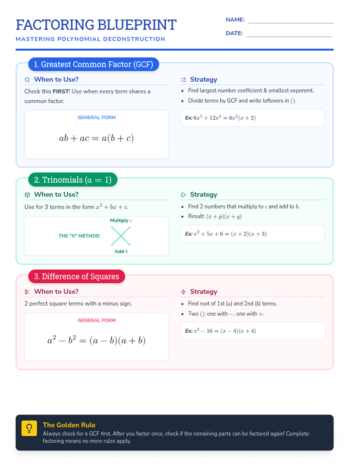 A two-page comprehensive reference sheet for Algebra. The first page features a graphic organizer for factoring (GCF, Trinomials, Difference of Squares), and the second page provides step-by-step guides and examples for multiplying, dividing, adding, and subtracting rational functions.