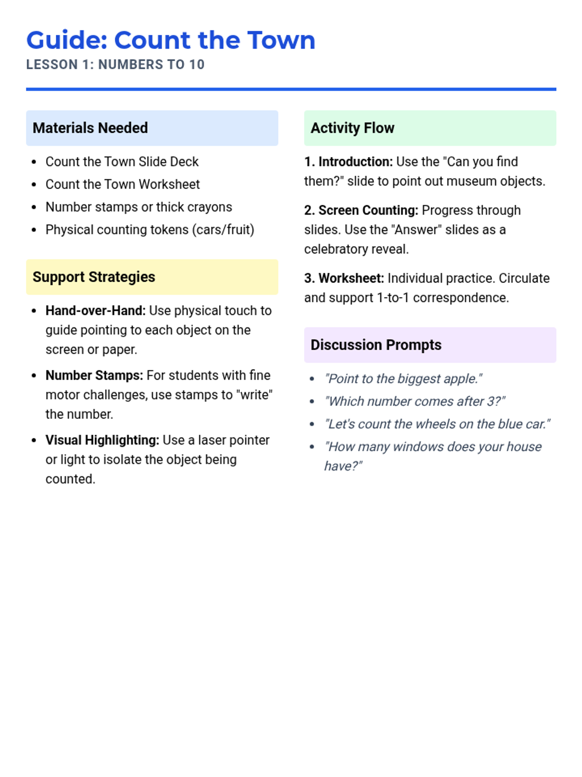 A detailed teacher's guide with specific accommodations for special needs students, activity flow, and discussion prompts for teaching numbers to 10.