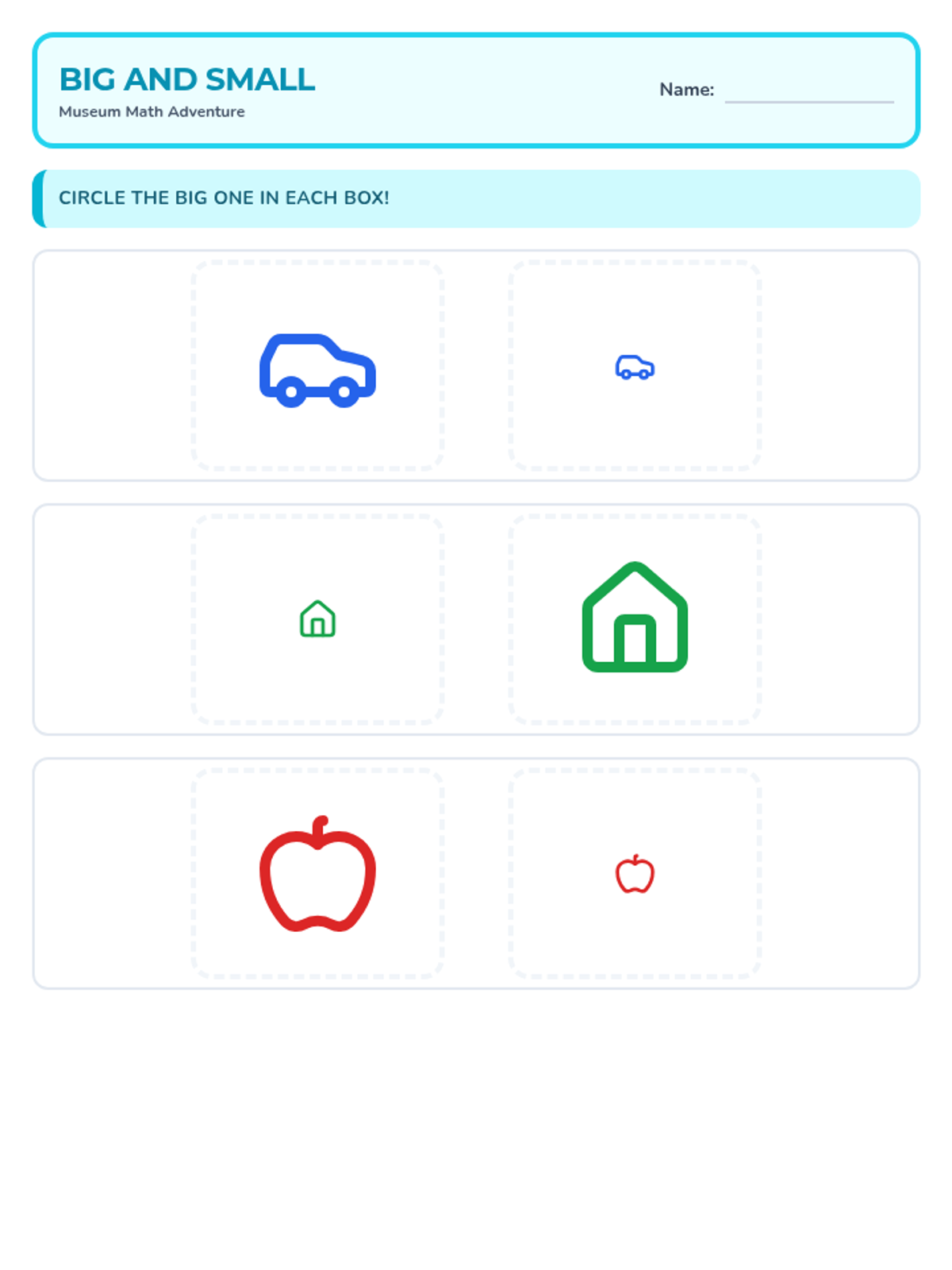 A size comparison worksheet where students circle the larger of two museum-themed objects, designed with clear, high-contrast icons for preschool accessibility.