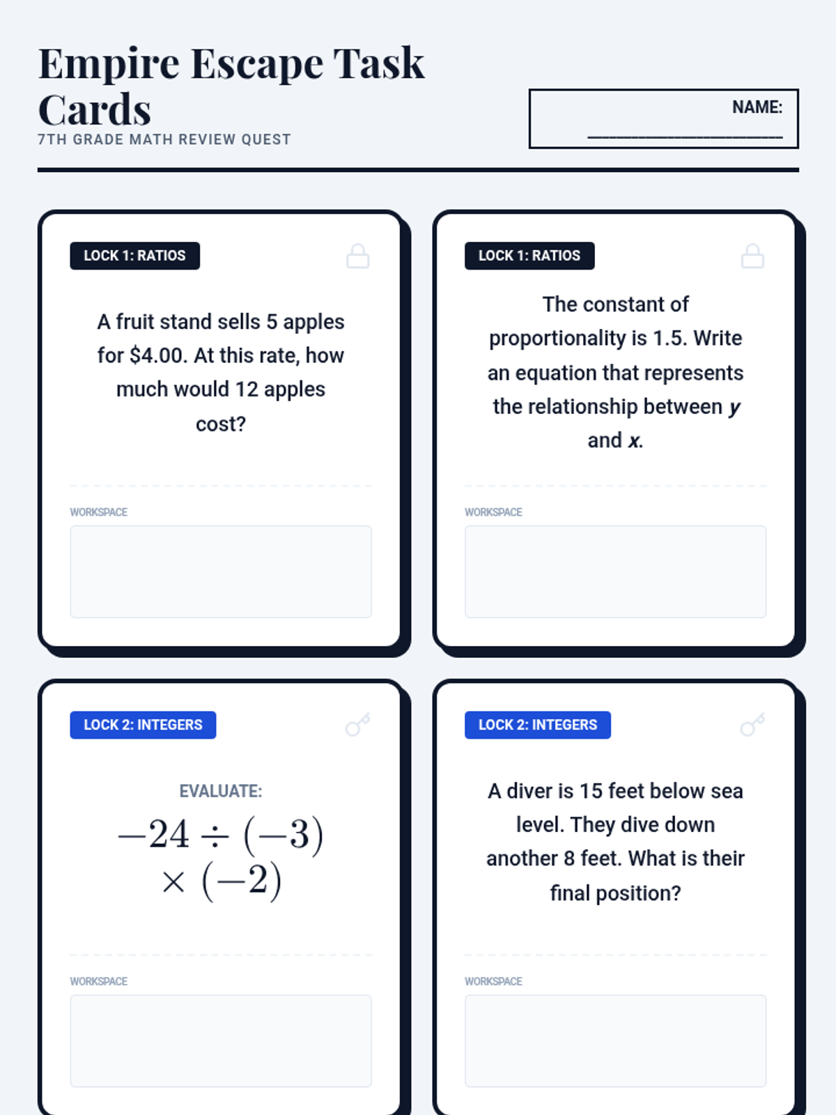 A set of 8 task cards organized into 4 'Locks' (Ratios, Integers, Algebra, and Geometry/Stats) for an escape room style activity. Each card features a standard-aligned problem and a dedicated workspace for student answers.