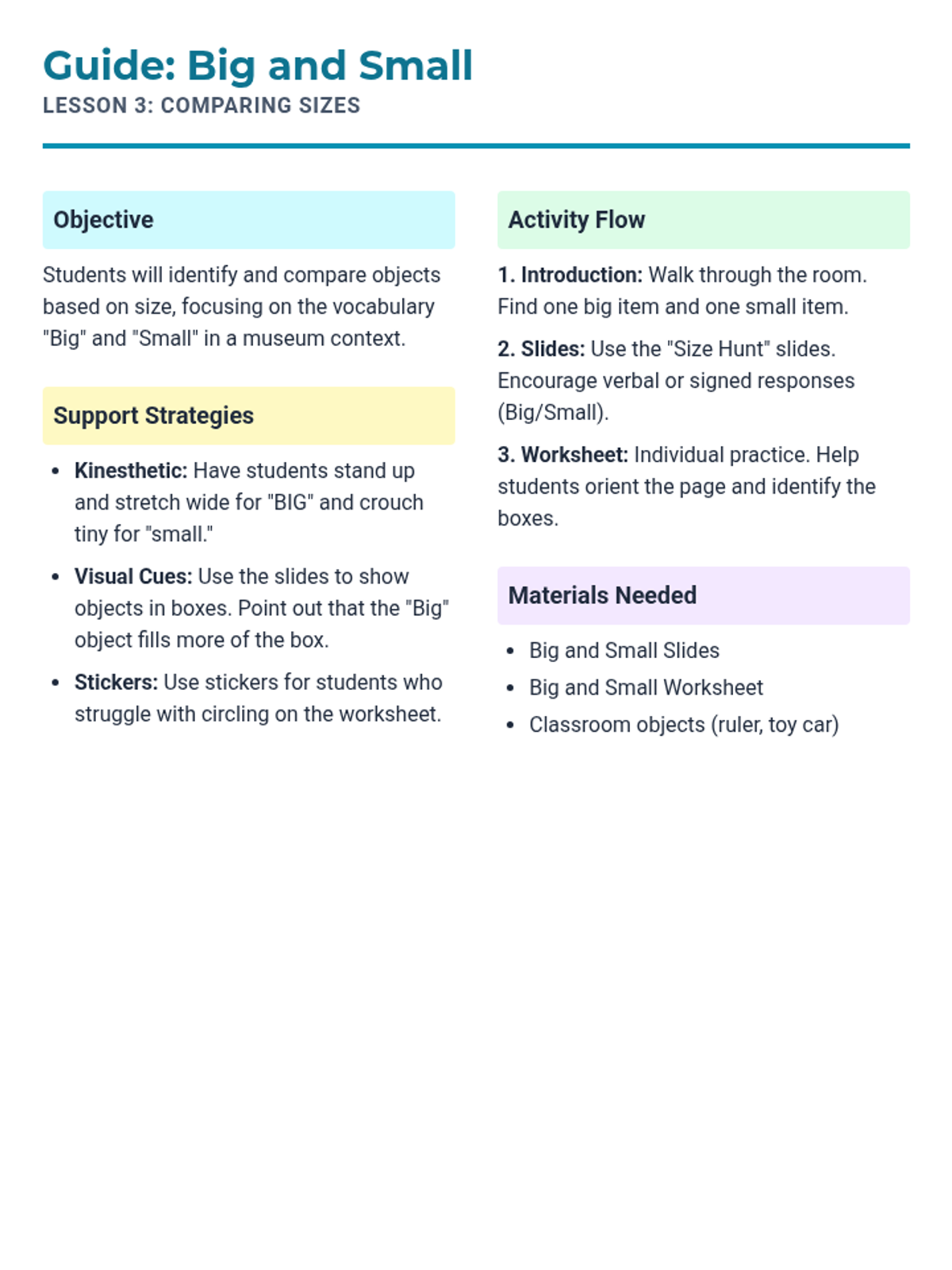 A facilitation guide for teaching size comparison, focusing on pre-field trip vocabulary and kinesthetic learning strategies for special needs preschool.