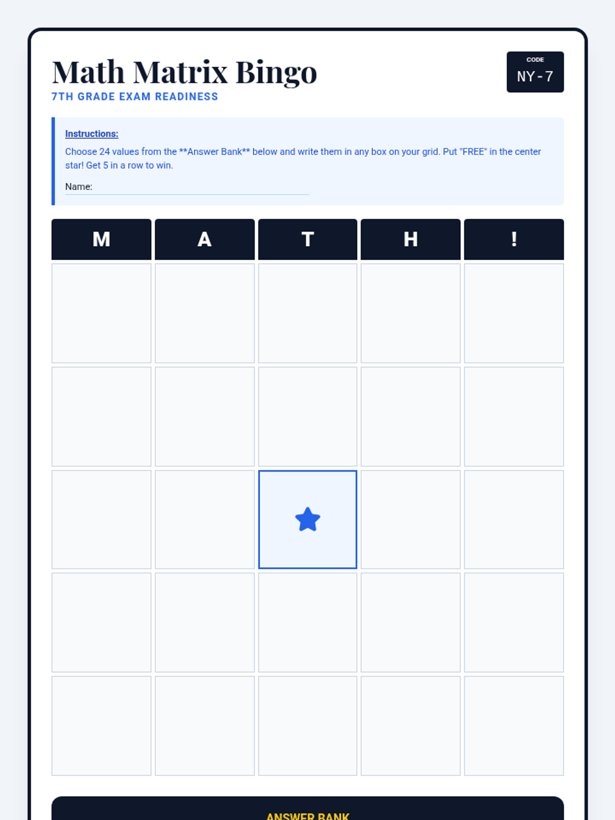 A math bingo kit featuring a student bingo board with various 7th-grade math answers and a caller sheet for the teacher with 20 corresponding problems covering integers, algebra, and geometry.