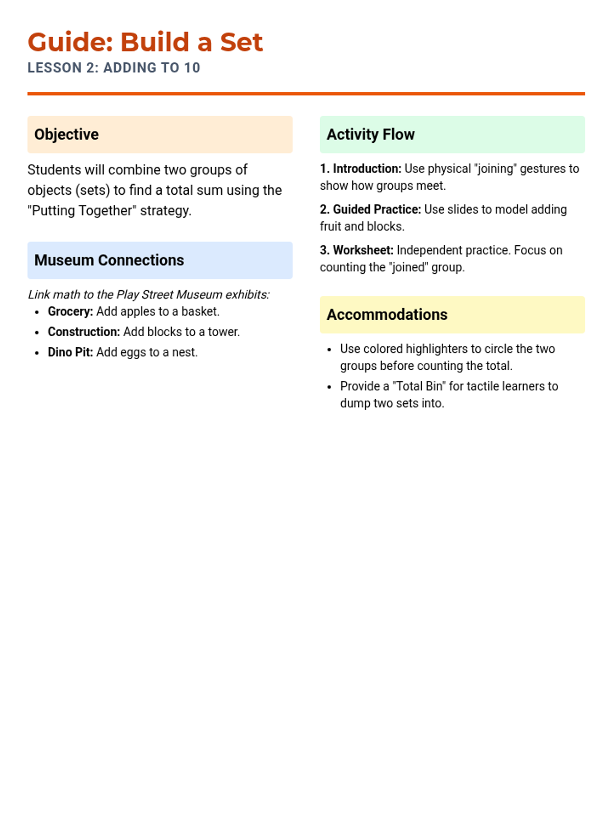 A facilitation guide for teaching simple addition, featuring the 'Putting Together' strategy and sensory-based accommodations for special needs learners.