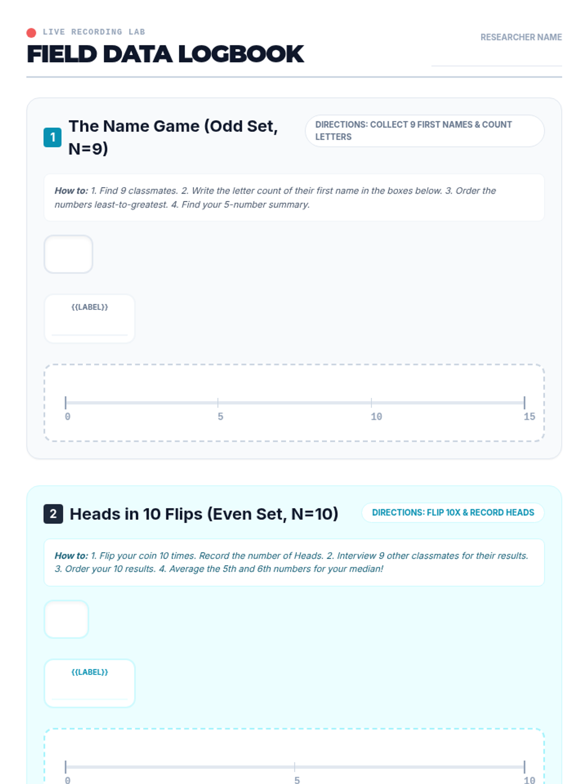 A student activity sheet for recording and analyzing name lengths (odd data set) and coin flip results (even data set) to create box plots. Includes step-by-step directions.