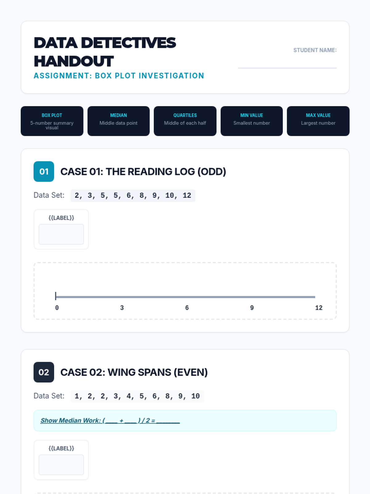A student worksheet titled 'Data Detectives Handout' covering construction of box plots for odd and even data sets, and interpretation skills.
