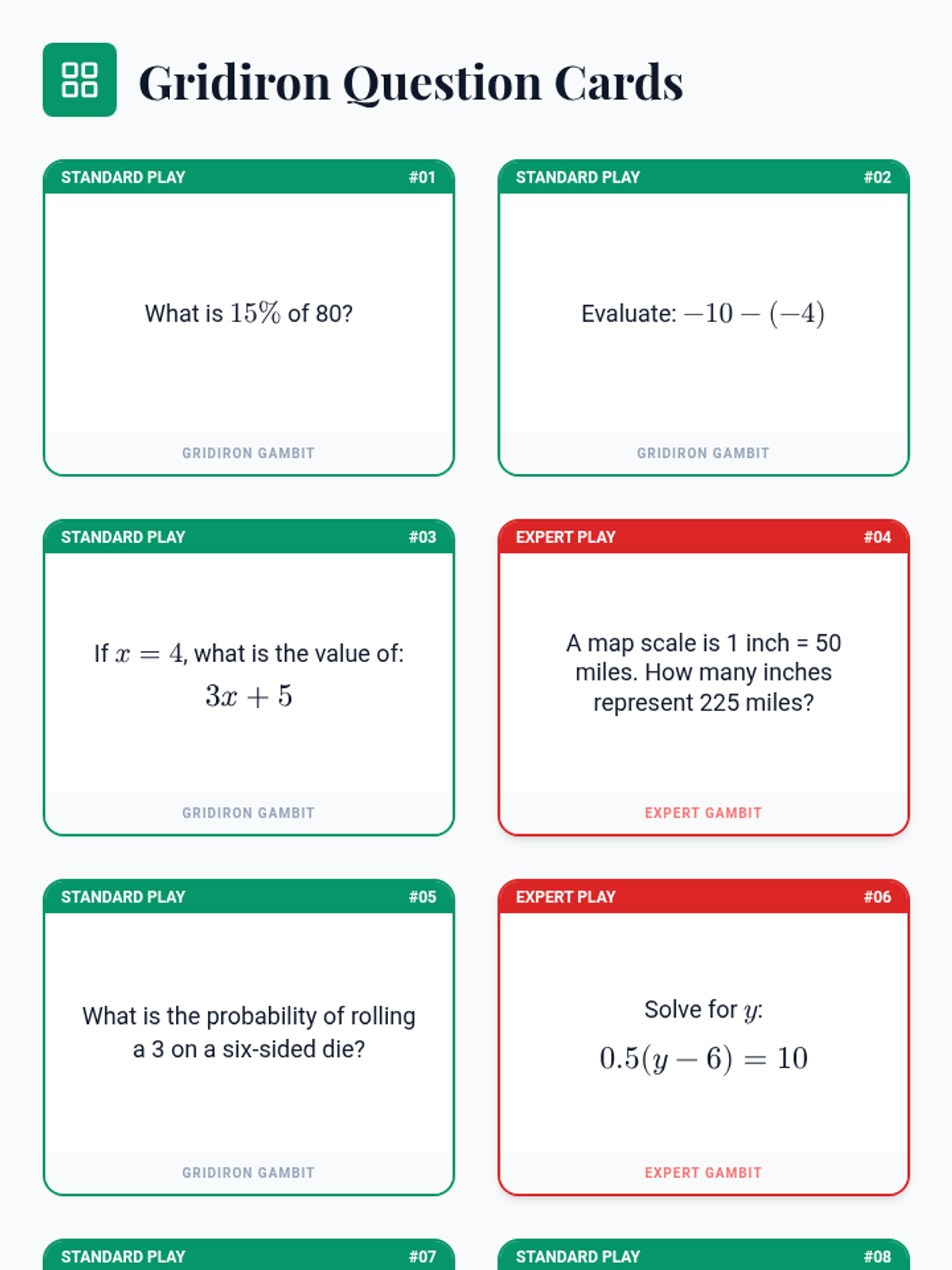A set of 8 math question cards for the Gridiron Gambits board game, categorized by 'Standard Play' and 'Expert Play' difficulty levels. Topics include percentages, integers, algebra, and probability.