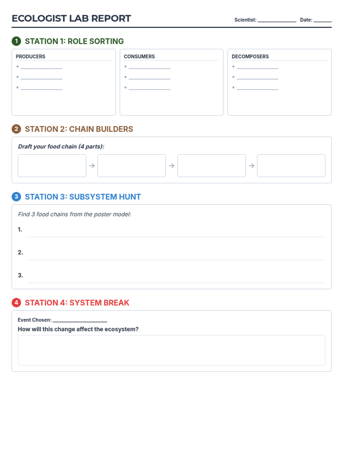 Recording sheet for students to document their observations and work from the ecosystem stations, revised to fix page breaks and improve contrast. All stations now fit on a single page. Fixed redundant text in Station 4.