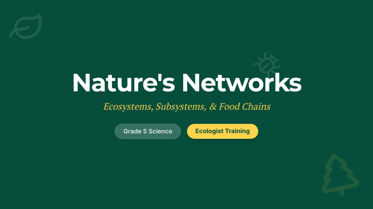 Instructional slides for ecosystems lesson, updated with a high-contrast 'Eco-Vibrant' color palette featuring deep emerald, golden ambers, and soft sage tones. Visual hierarchy and accessibility improved throughout. Fixed layout bleeding and viewport issues.