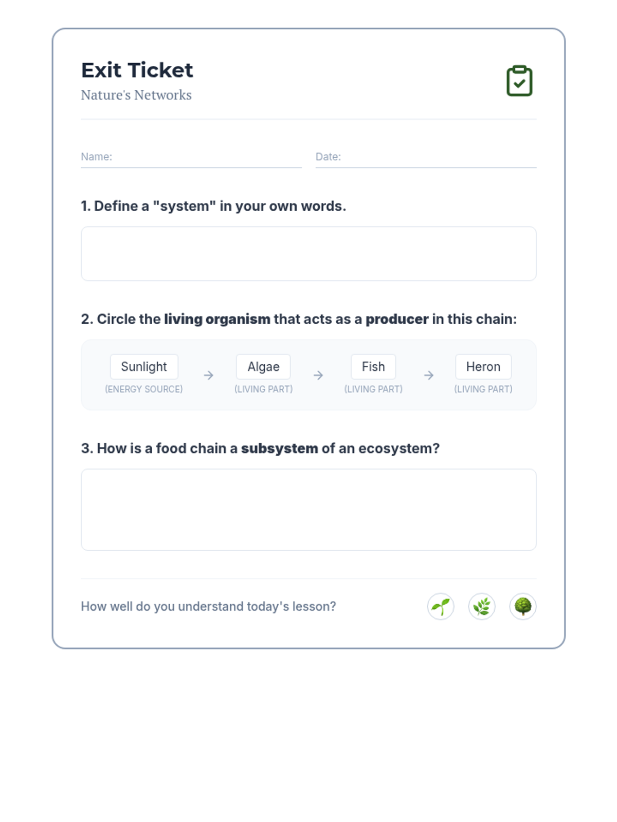 A short assessment to check for student understanding of systems, ecosystem roles, and subsystems. Revised to improve background contrast and clarity on sunlight vs organisms.