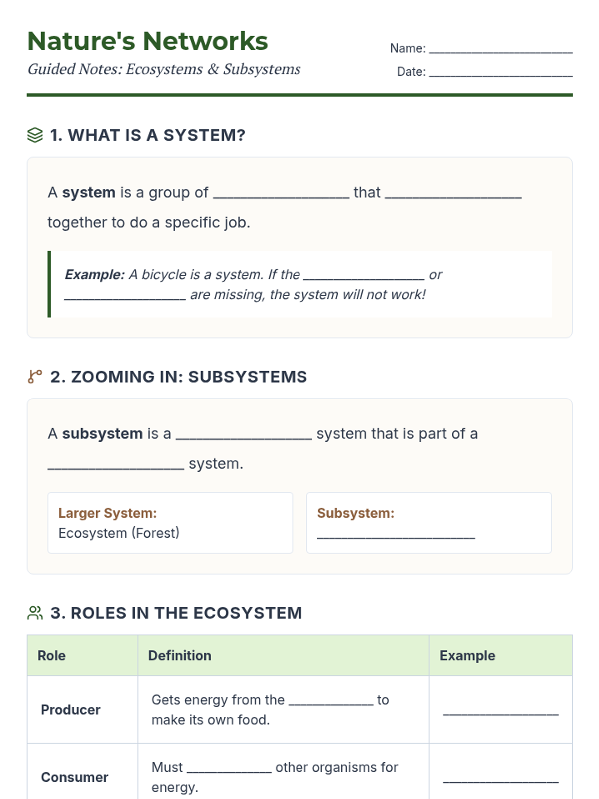 Guided notes for students to complete while following the "Nature Networks" slideshow, covering key terms and concepts about systems and ecosystem roles.