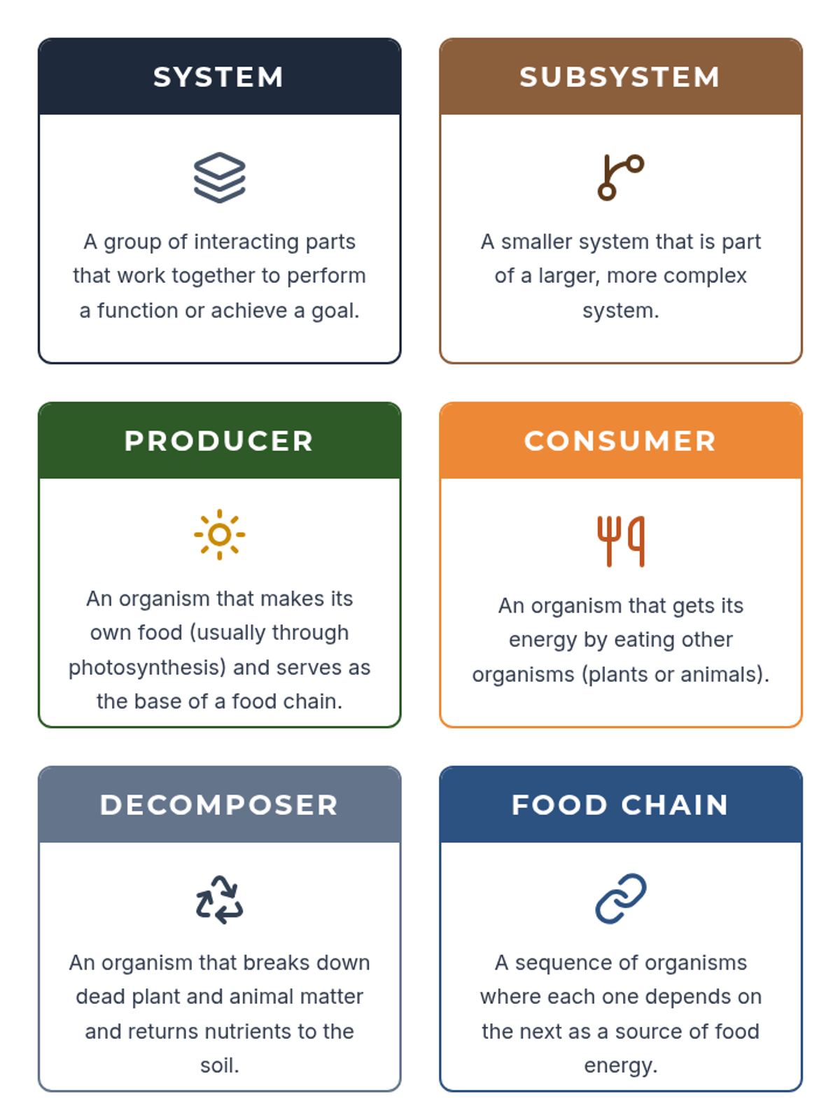 Visual vocabulary cards for key ecosystem terms, featuring definitions and icons. Revised to fix page break issues, icon contrast, and incomplete definitions.