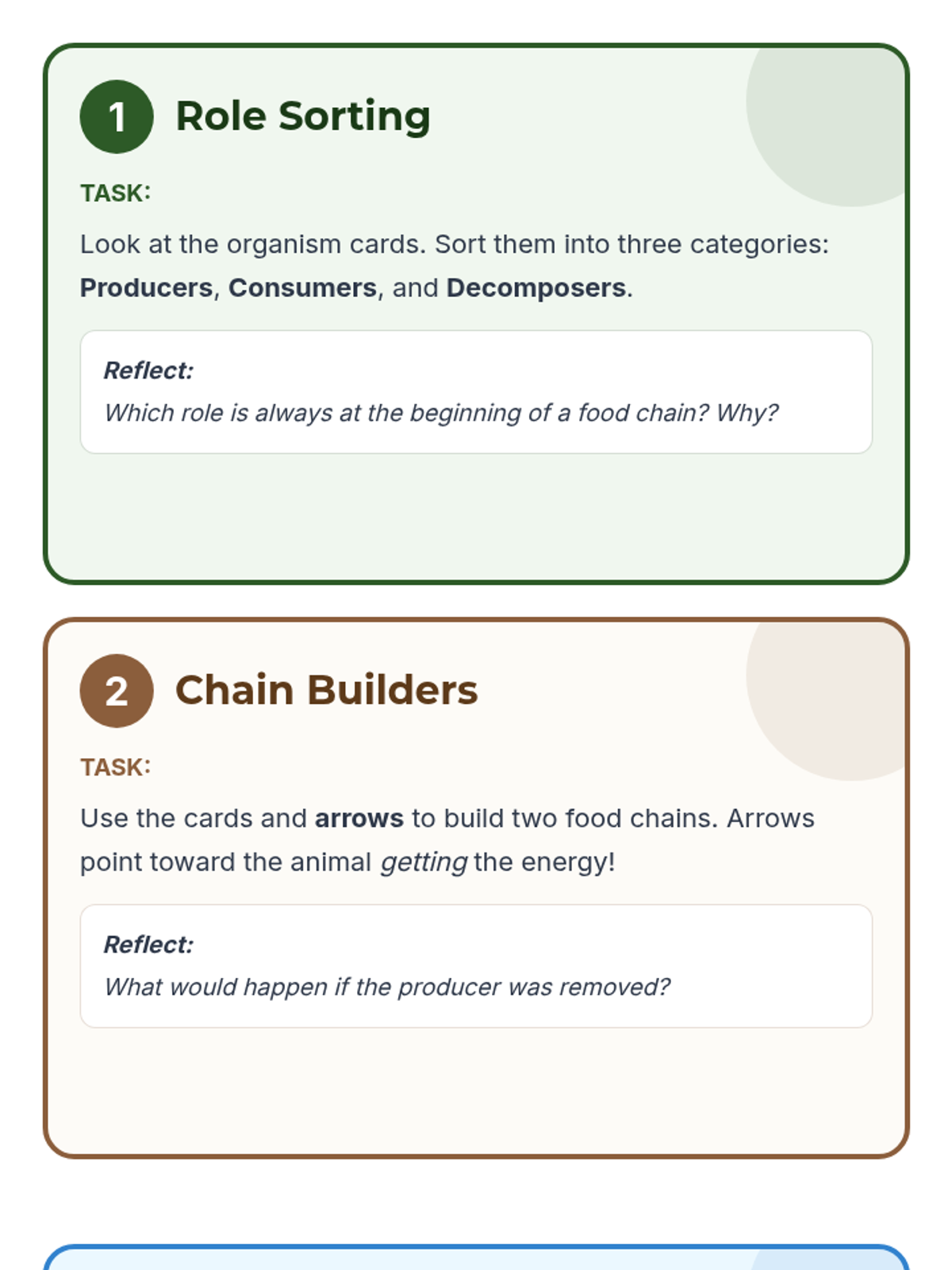 Direction signs for four hands-on stations exploring ecosystem roles, food chain construction, subsystem identification, and system stability. Now includes printable organism and event cards. Revised to ensure signs fit on single pages. Added more event cards and fixed poster overlap.