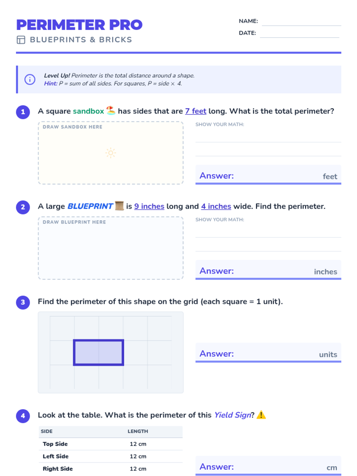 A second 10-problem worksheet for 3rd-grade students focused on perimeter, featuring different numerical values and scenarios while maintaining the 'Blueprints & Bricks' theme. It includes word problems, grid shapes, table data, and a bar graph interpretation challenge. Optimized layout for 2 pages.