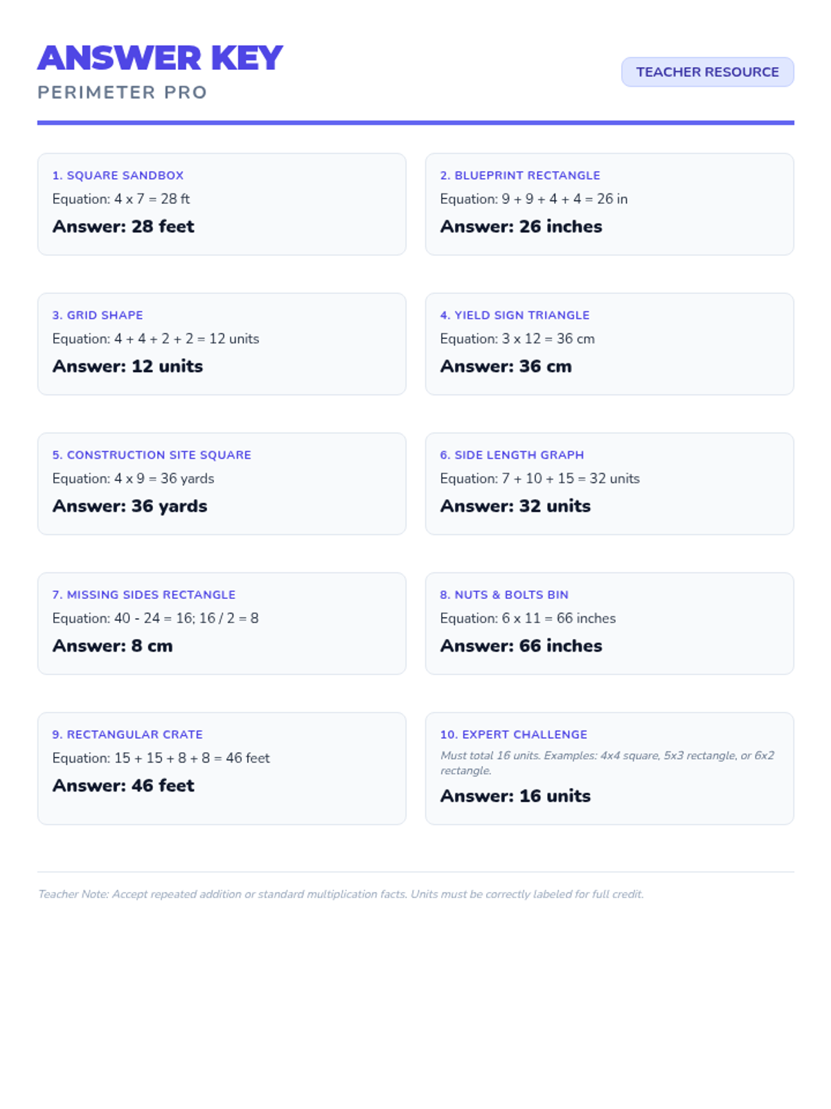 A detailed answer key for the Perimeter Pro Worksheet, including equations and final answers for all 10 problems. Optimized as a single-page teacher resource.