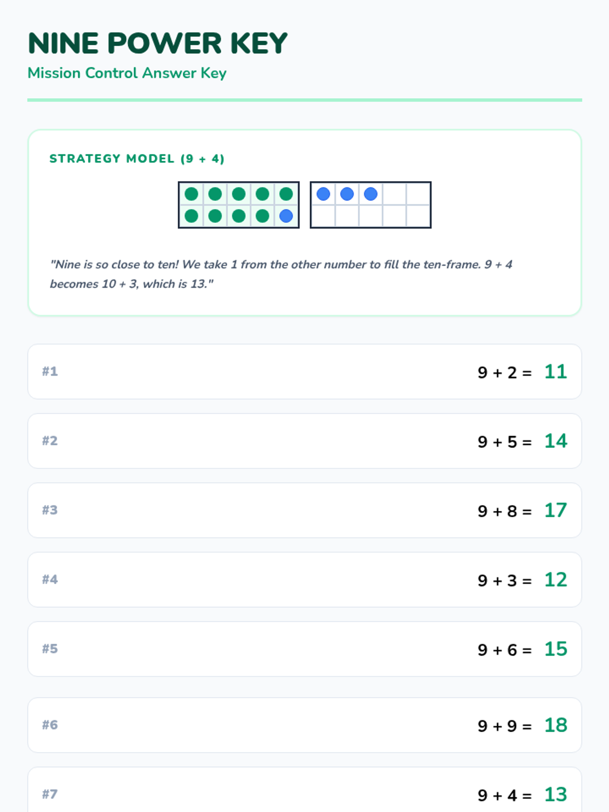 A detailed answer key for the Power Block Addition Worksheet, featuring solutions for all 20 problems and teaching tips.