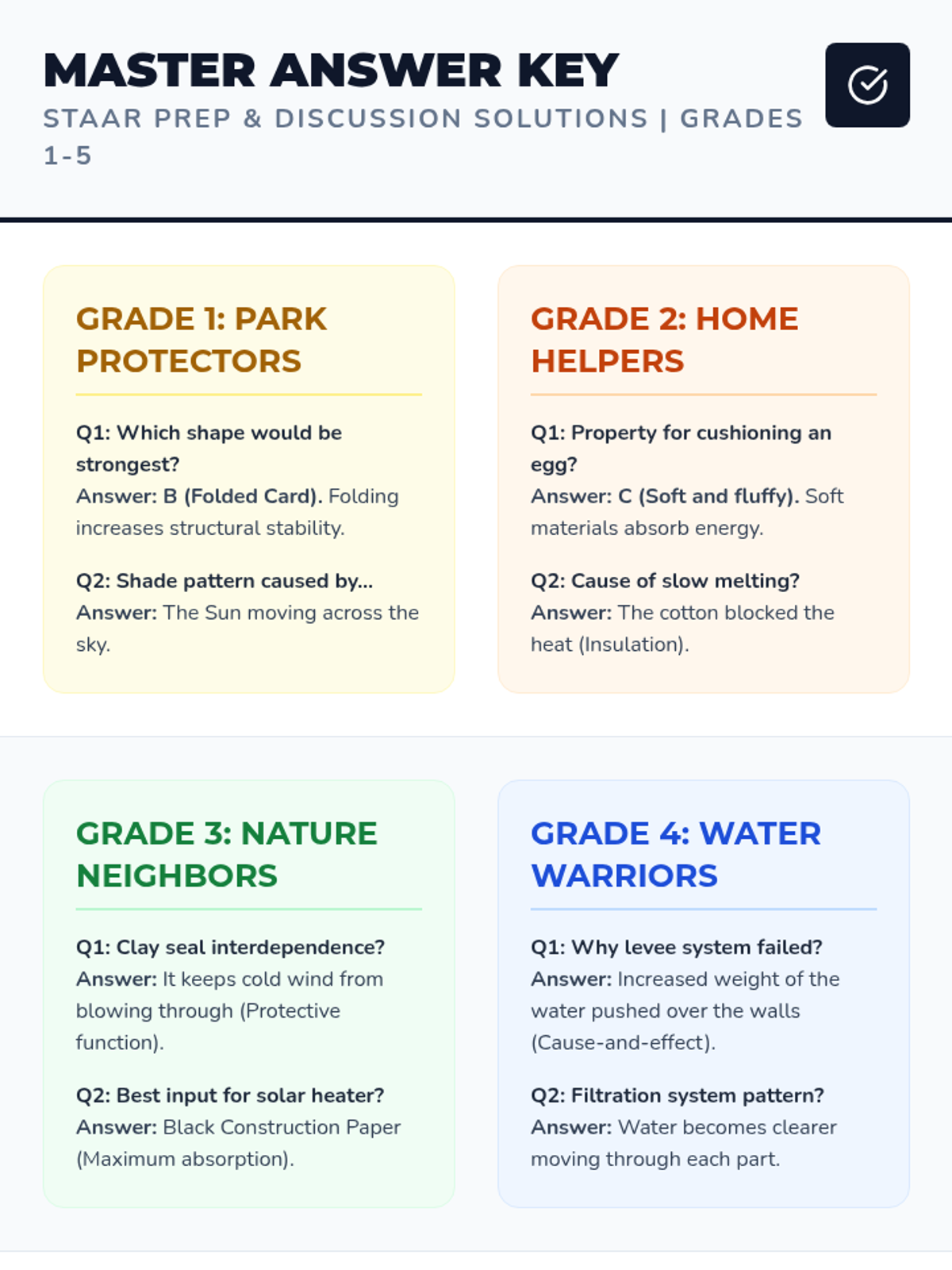 A comprehensive answer key for all STAAR-style prep questions and challenge discussions across Grades 1-5 in the City Solvers curriculum.