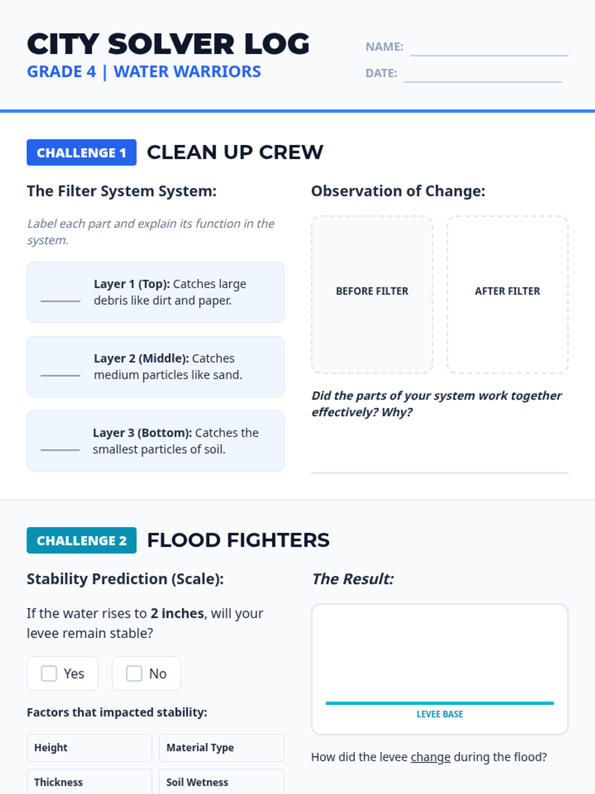 A student activity log for Grade 4 STEM challenges featuring filter system labels, levee stability results, and STAAR-style prep questions.