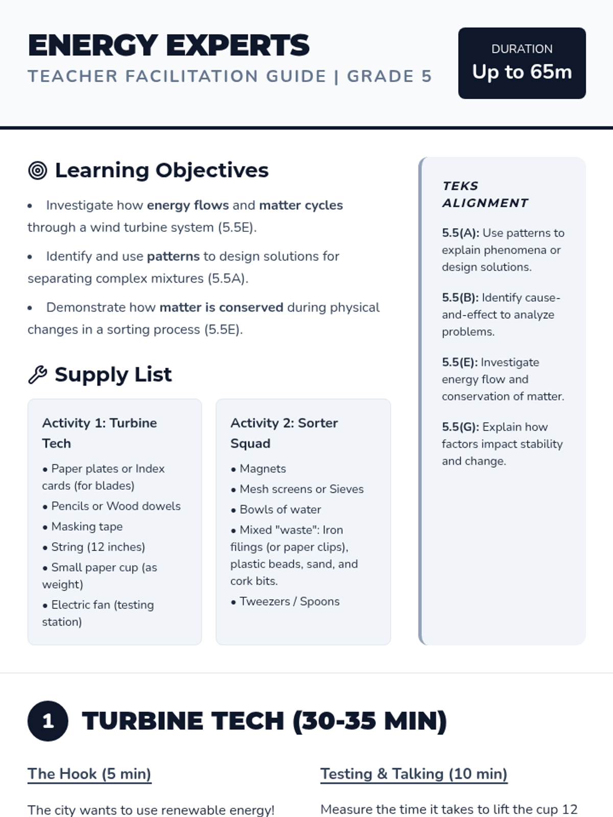 A detailed teacher guide for Grade 5 STEM activities focusing on wind turbines and matter separation, aligned with TEKS 5.5.