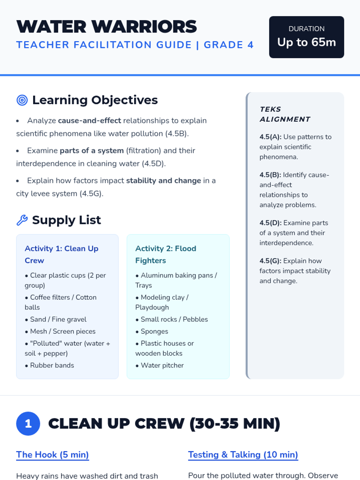 A detailed teacher guide for Grade 4 STEM activities focusing on water filtration and flood defense systems, aligned with TEKS 4.5.