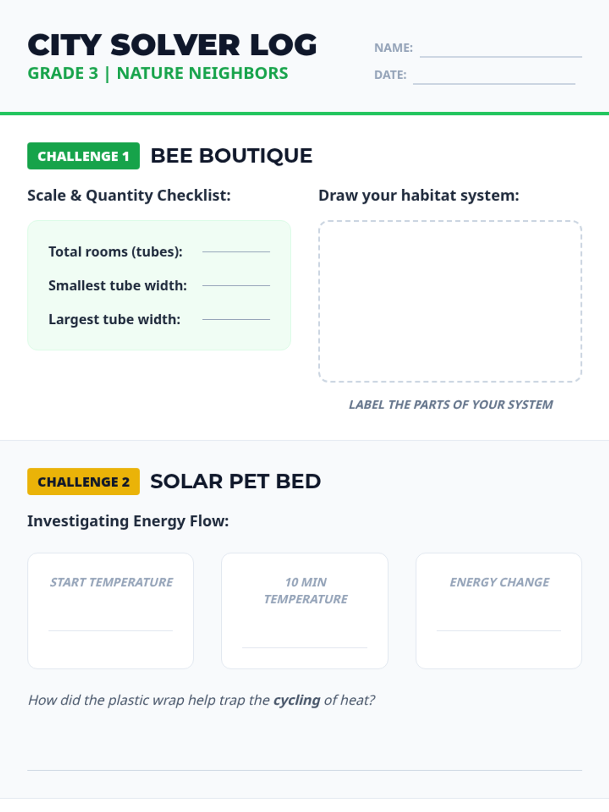 A student activity log for Grade 3 STEM challenges featuring habitat scale descriptions, energy flow observation tables, and STAAR-style prep questions.