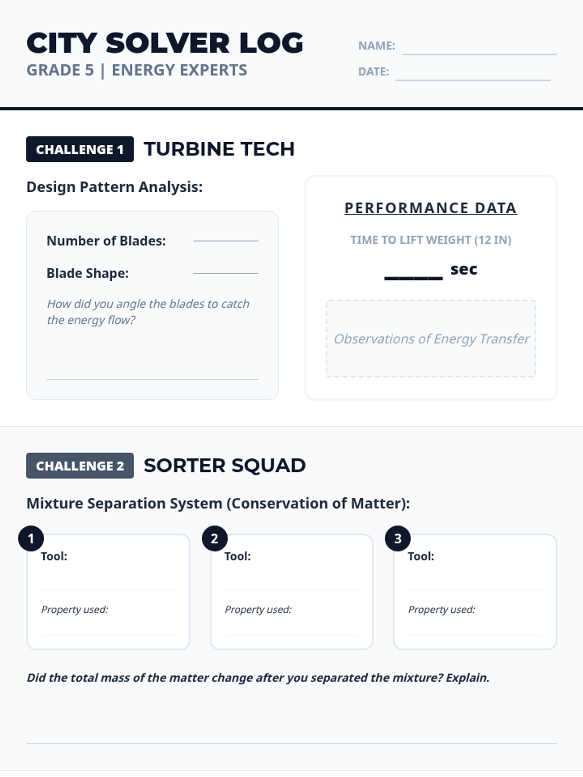 Engaging slides for Grade 5 STEM challenges "Turbine Tech" and "Sorter Squad," focusing on energy flow and conservation of matter.